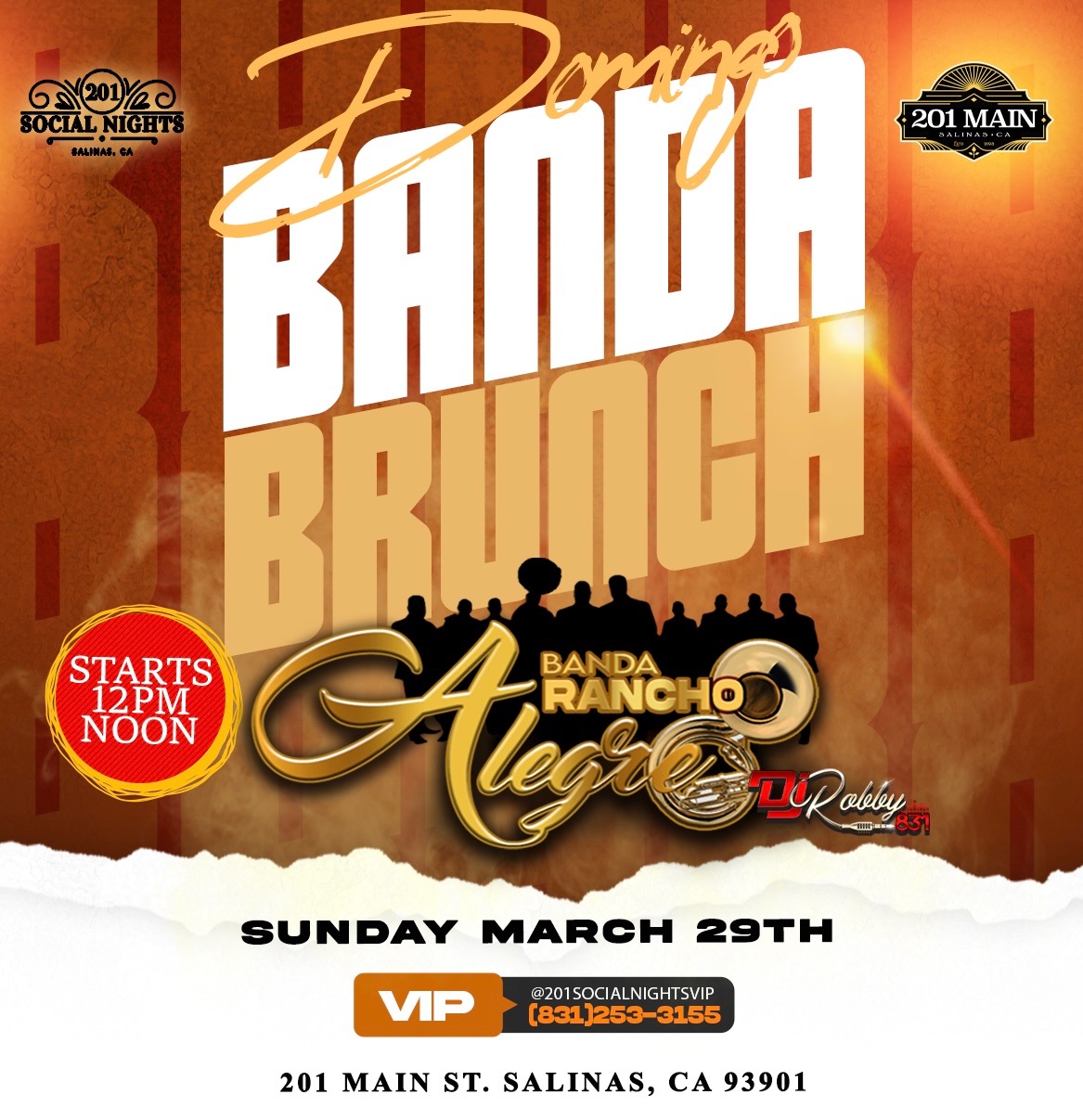 Get ready para un Sunday lleno de buena musica y vibes con banda Rancho Alegre y DJ Robby poniendo el ambiente todo el dia.