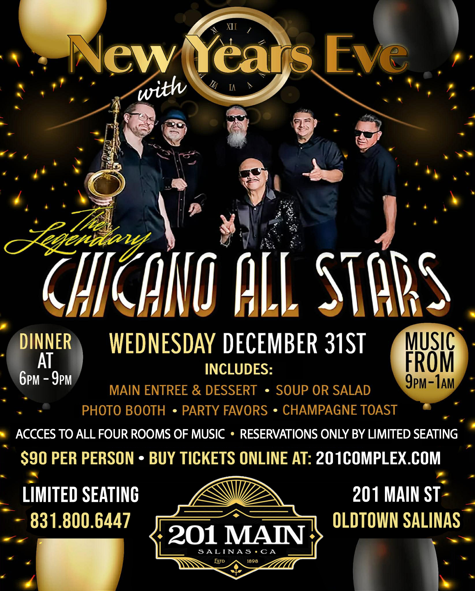 Chicano All Stars Dinner & Dance December 31 2025 | 6:00 PM - 1:00 AM 201 Main St., Salinas, CA 93901 Purchase Tickets $90.00 Please, select a ticket type Ticket Type* Ticket Type Chicano All Stars Dinner & Dance Ticket - $90.00 NYE All 4Room Access General Admission - $45.00 OLD SCHOOL ROOM ONLY- Early Bird - $30.00 Please, enter a valid first name First Name* Please, enter a valid last name Last Name* Please, enter a valid email Email* Add Ticket To Cart Please check errors in the form above.