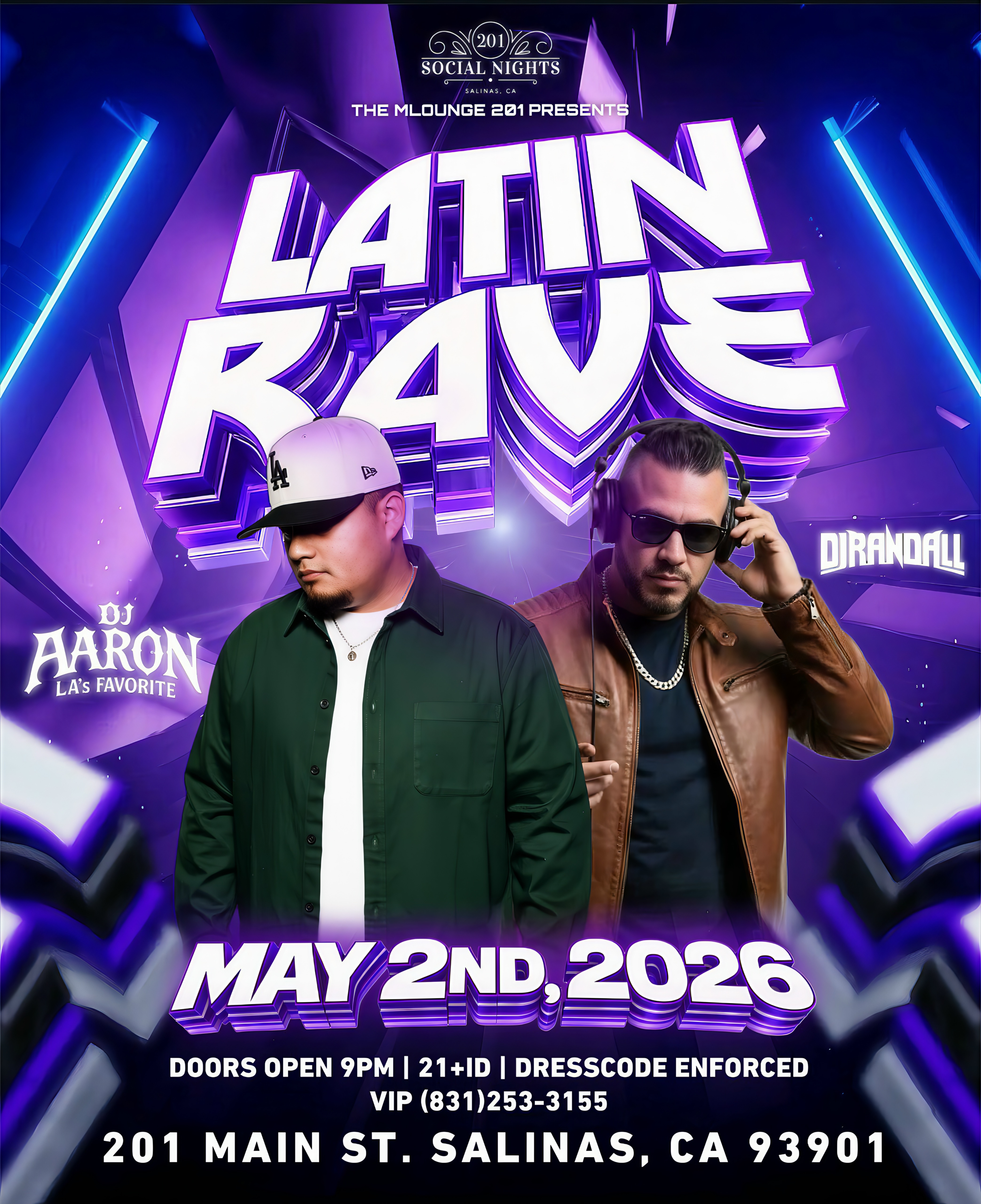 Latin Rave May 22 2026 | 9:00 PM - 1:30 AM 201 Main St., Salinas, CA 93901 Purchase Tickets $20.00 Please, select a ticket type Ticket Type* Ticket Type Pre-Sale Latin Rave 5/22/26 - $20.00 Please, enter a valid first name First Name* Please, enter a valid last name Last Name* Please, enter a valid email Email* Add Ticket To Cart Please check errors in the form above.