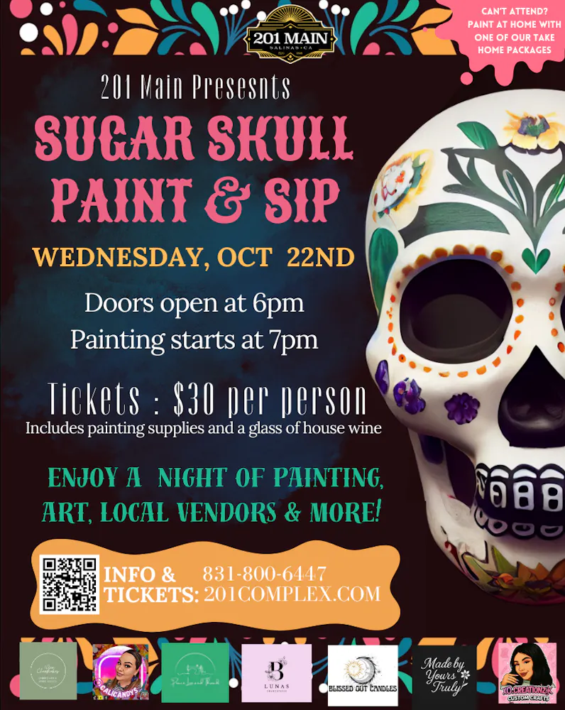 Join us for an unforgettable evening at 201 Main’s Sugar Skull Paint & Sip on Wednesday, October 22nd. Doors open at 6pm and painting begins at 7pm. Get here before doors close at 7:15pm.